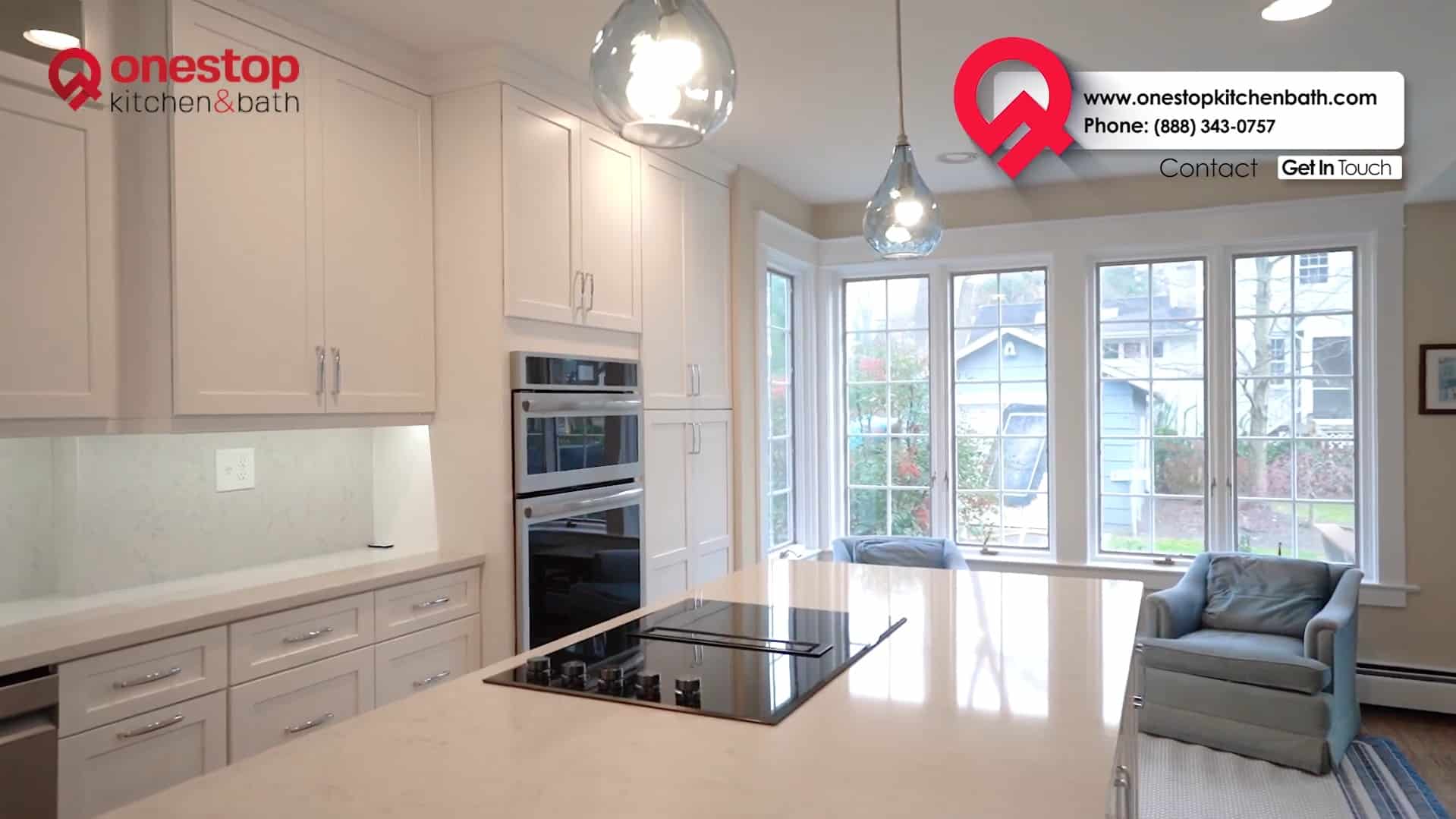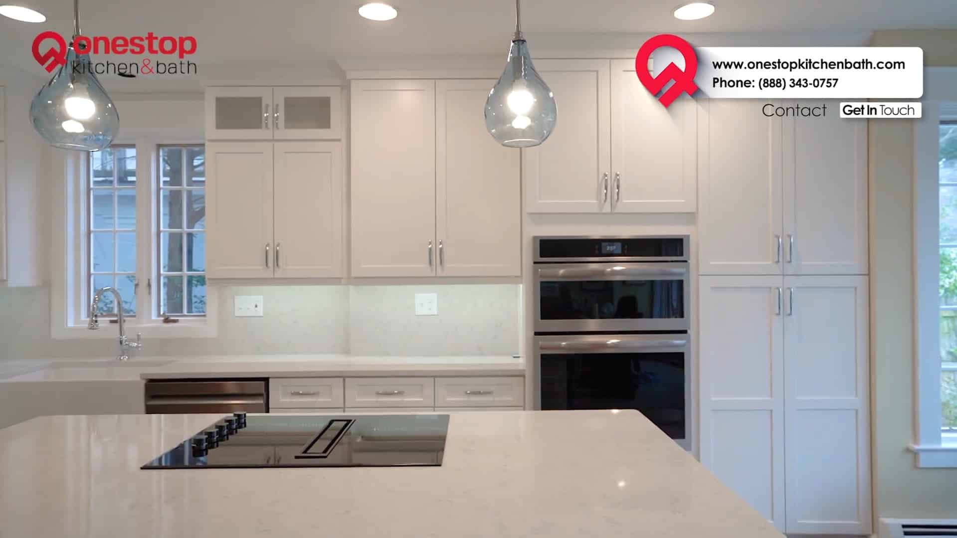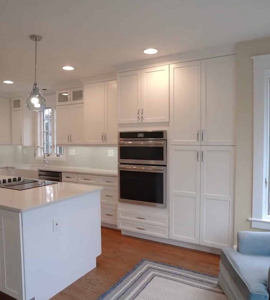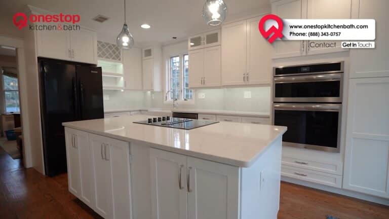 This modern white kitchen remodel blends clean design with everyday functionality. Custom white shaker cabinets with full-height storage maximize space, while a spacious quartz island with built-in cooktop anchors the L-shaped layout. Double wall ovens, layered lighting, and warm finishes create a bright, refined kitchen ideal for cooking and entertaining.