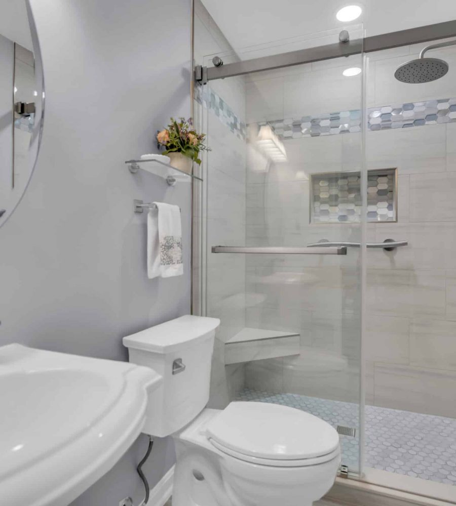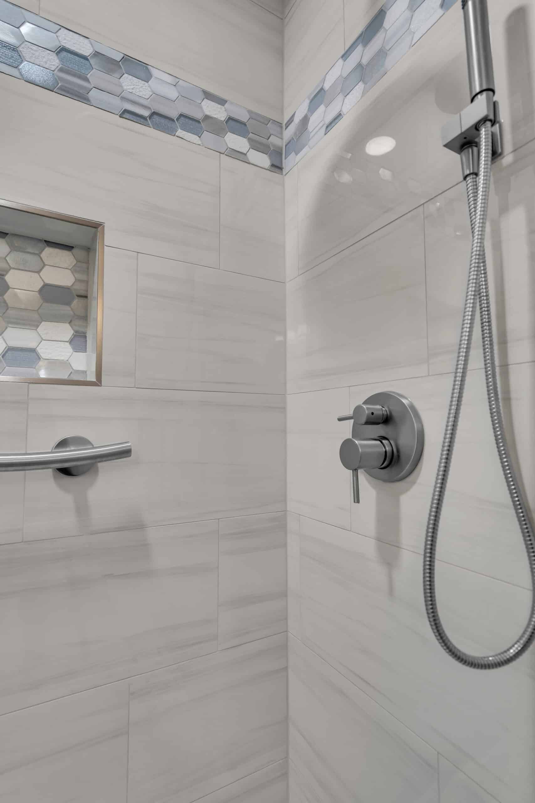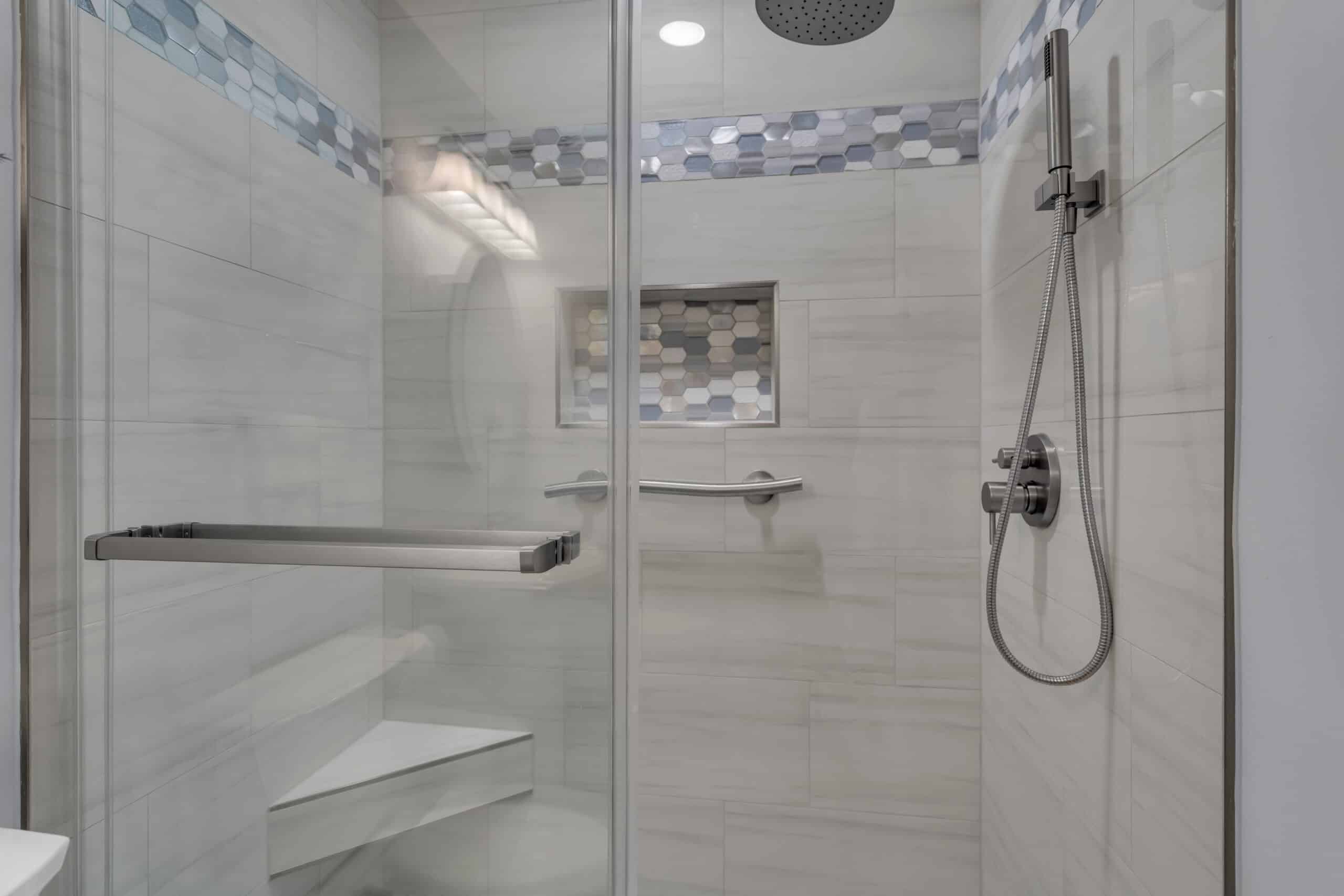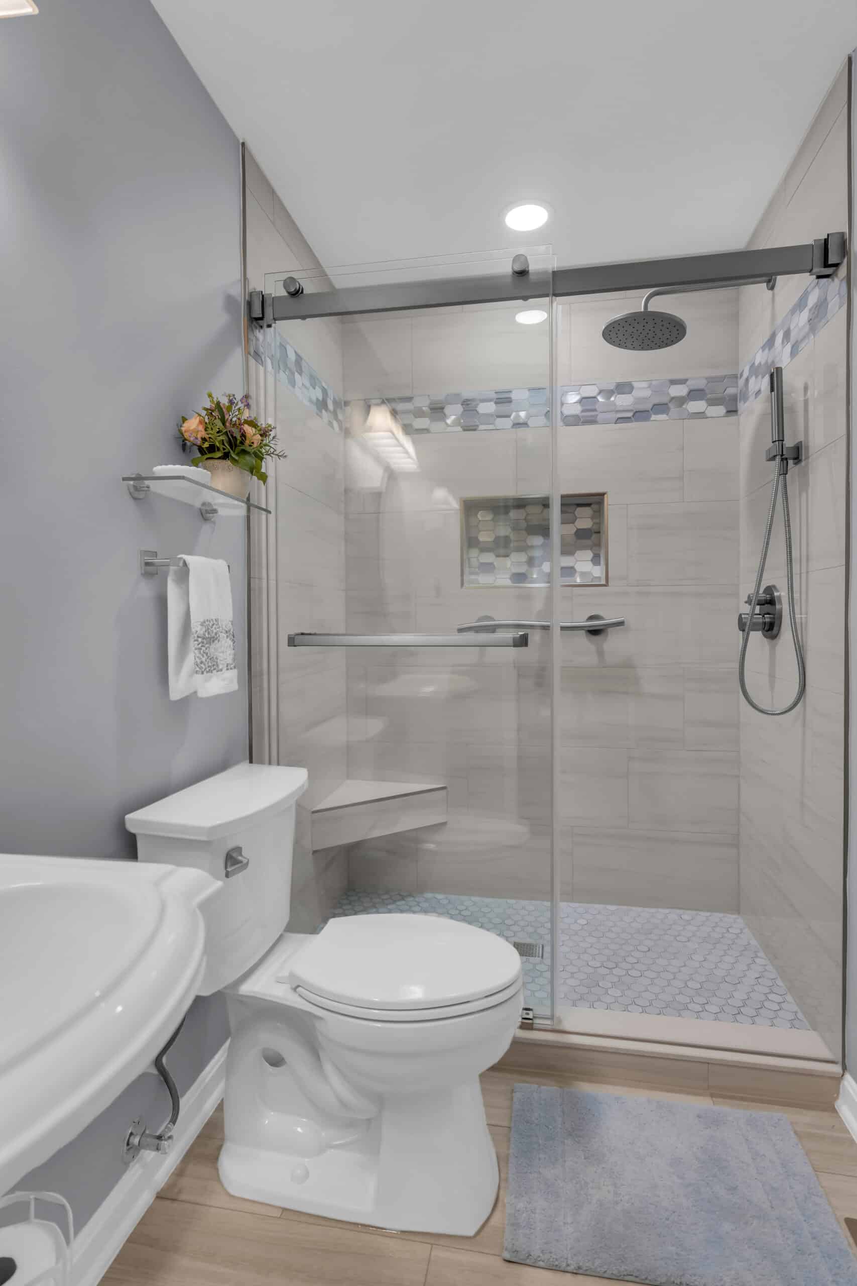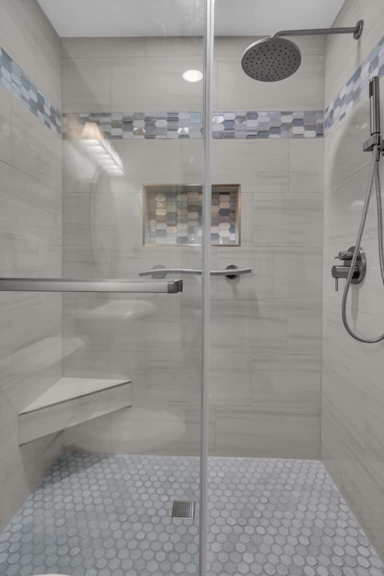 This modern bathroom blends style, functionality, and spa-like comfort. Large-format wall tiles pair with hexagonal mosaic accents on the shower floor. Signature features include a recessed storage niche, corner shower bench, circular medicine cabinet, rainfall showerhead, and brushed nickel fixtures. Every detail was chosen to create a timeless, relaxing retreat.