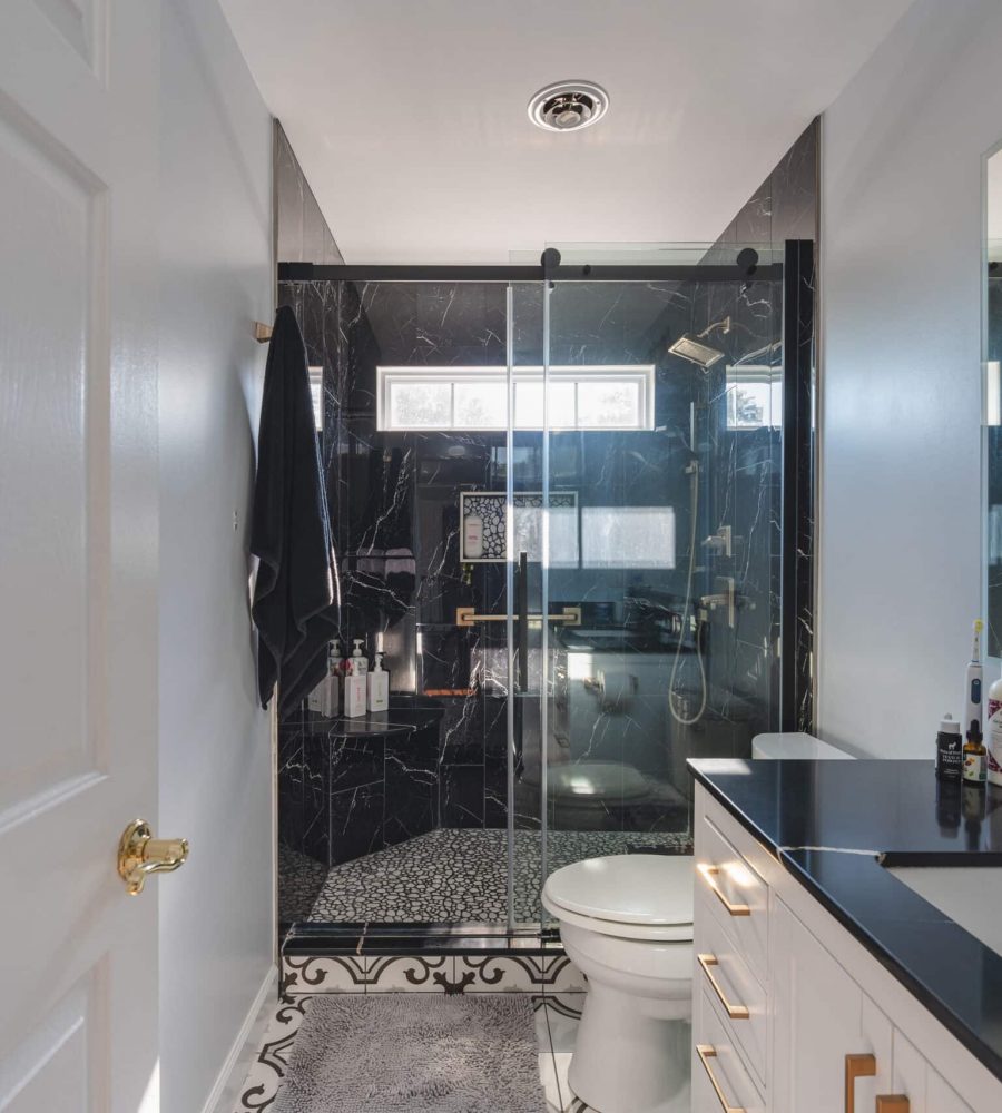 We completely renovated 2 bathrooms for this bathroom remodel project in Nokesville, VA. On the black bathroom, we upgrade the entire look and functionality of the bathroom by adding white contemporary vanity with black countertop, and an elegant shower surround. We also changed the outdated shower doors and tiles with modern ones that make the bathroom look more clean, pleasing, and organized. For the other bathroom, we used traditional cabinets and a bath tub with brown surround.