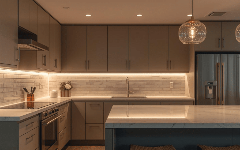 Integrate lighting solutions within your cabinet design for both function and ambiance. Under-cabinet LED strips illuminate work surfaces while adding gentle ambient lighting to the overall space.