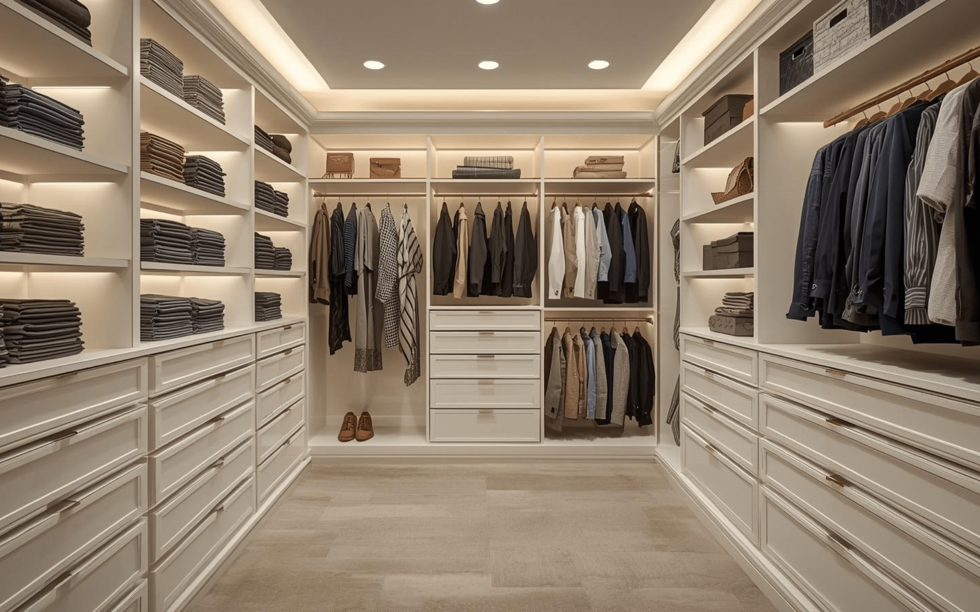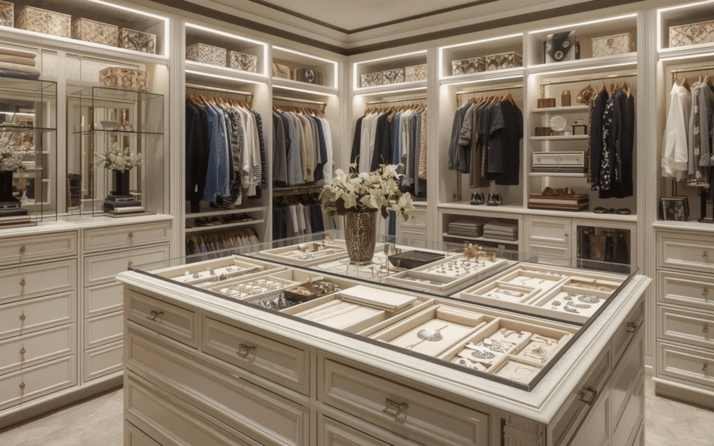 A center island featuring felt-lined drawers creates a luxury jewelry store experience in your own closet. Shallow drawers with custom compartments separate rings, earrings, necklaces, and watches, preventing tangling and damage.