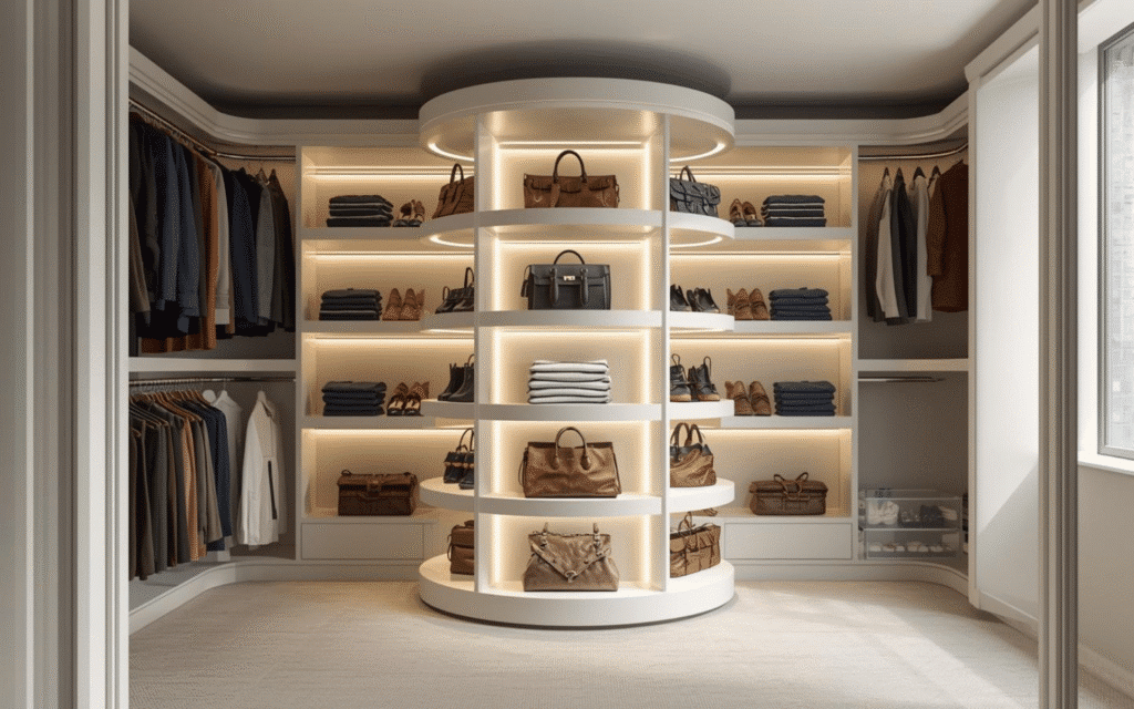 Maximize corner spaces with rotating carousel shelves that bring stored items to you. These rotating units work perfectly for shoes, handbags, or folded clothes, eliminating the frustration of reaching into dark corner spaces.